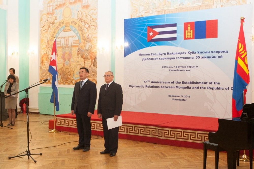 Minister of Foreign Affairs of Mongolia, L.Purevsuren and Ambassador of Cuba to Mongolia Omar Marrero Betancourt hosted the ceremony upon the establishment of the 55th anniversary of the diplomatic relations between Mongolia and the Republic of Cuba at the Ministry of Foreign Affairs of Mongolia.