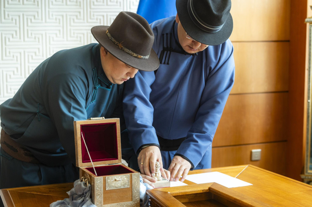 Ya.Sodbaatar, Chief of Staff of the Office of the President, D.Enkhbat, Secretary General of the Parliament, stamped the State seal on the laws of Mongolia which were approved in 2023.