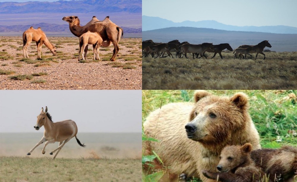 In Mongolia, the Great Gobi six animals are the wild Bactrain camel, onager, Gobi bear or Mazaalai, Przewalski's horse, black-tailed deer and the saiga.