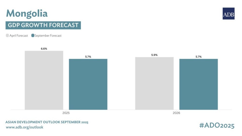 According to the Asian Development Outlook (ADO) September 2025 report, ADB projects Mongolia’s economic growth at 5.7% in both 2025 and 2026, down from April’s forecasts of 6.6% and 5.9%, respectively. Demand for Mongolia’s export minerals, especially coking coal, is expected to remain weak in 2025–2026 due to higher tariffs and trade restrictions affecting steel production in the People’s Republic of China (PRC). In addition, recent government spending cuts are likely to dampen consumption and public investment for the rest of 2025.