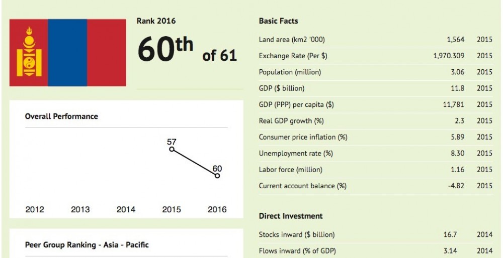 Mongolia has slipped three places to be ranked 60 out of 61 countries in the annual World Competitiveness Yearbook 2016, recently released by the International Institute for Management Development (IMD) World Competitiveness Center.